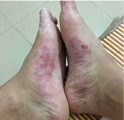脚气,系真菌感染引起,其皮肤损害往往是先单侧(即单脚)发生,数周或数月后才感染到对侧。足癣的皮肤损害有一特点,即边界清楚,可逐渐向外扩展。因病情发展或搔抓,可出现糜烂、渗液,甚或细菌感染,出现脓疱等。