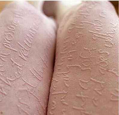 人工性荨麻疹也称皮肤划痕症荨麻疹,是患者对外来较弱的机械性刺激引起生理反应增强,于皮肤上产生风团。主要是手抓或钝器划其皮肤后,该处出现暂时性红色条状隆起。常见于搔抓后,或在紧束的腰带、袜带等处局部起风团瘙痒。