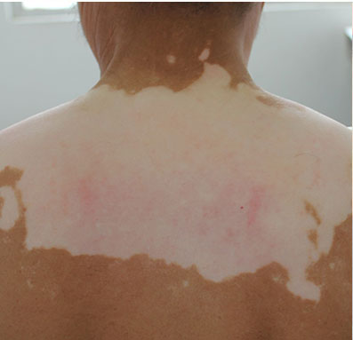 泛发型白斑是最为严重的一种白斑,白斑面积超过体表面积50%以上,皮损为境界清楚的白斑,表现为圆形、卵圆形或不整形,常由局限型或散发型发展而来。一般白斑对称分布于全身各处,有时仅存留小片岛屿状正常皮肤。
